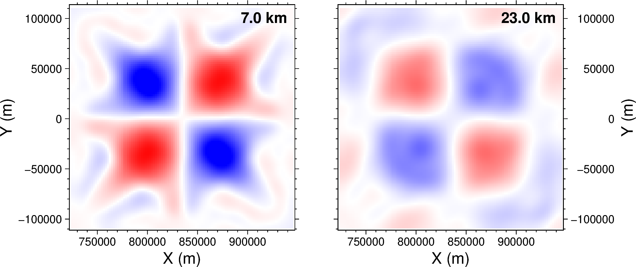 We select depth slices at 7 km and 23 km to visualize the Vs perturbation.
